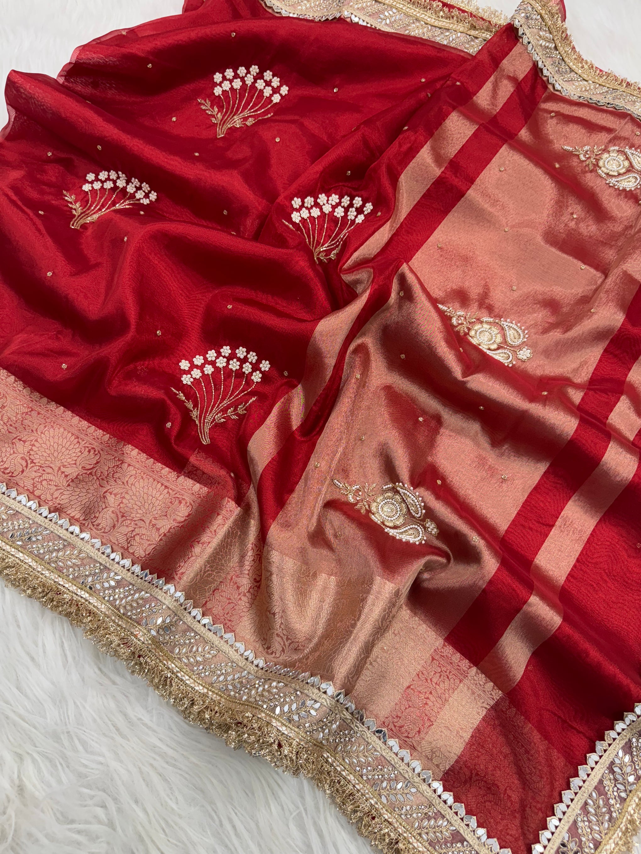 Deep red tissue silk saree with intricate pearl motifs, mirror borders, and hand zardozi detailing. A masterpiece of Banarasi craftsmanship, perfect for weddings, festive occasions, and evening soirees.