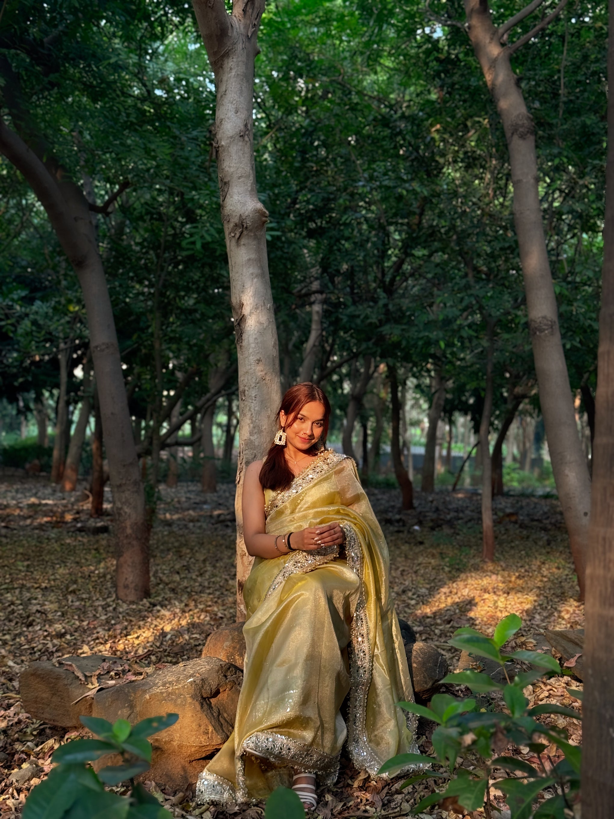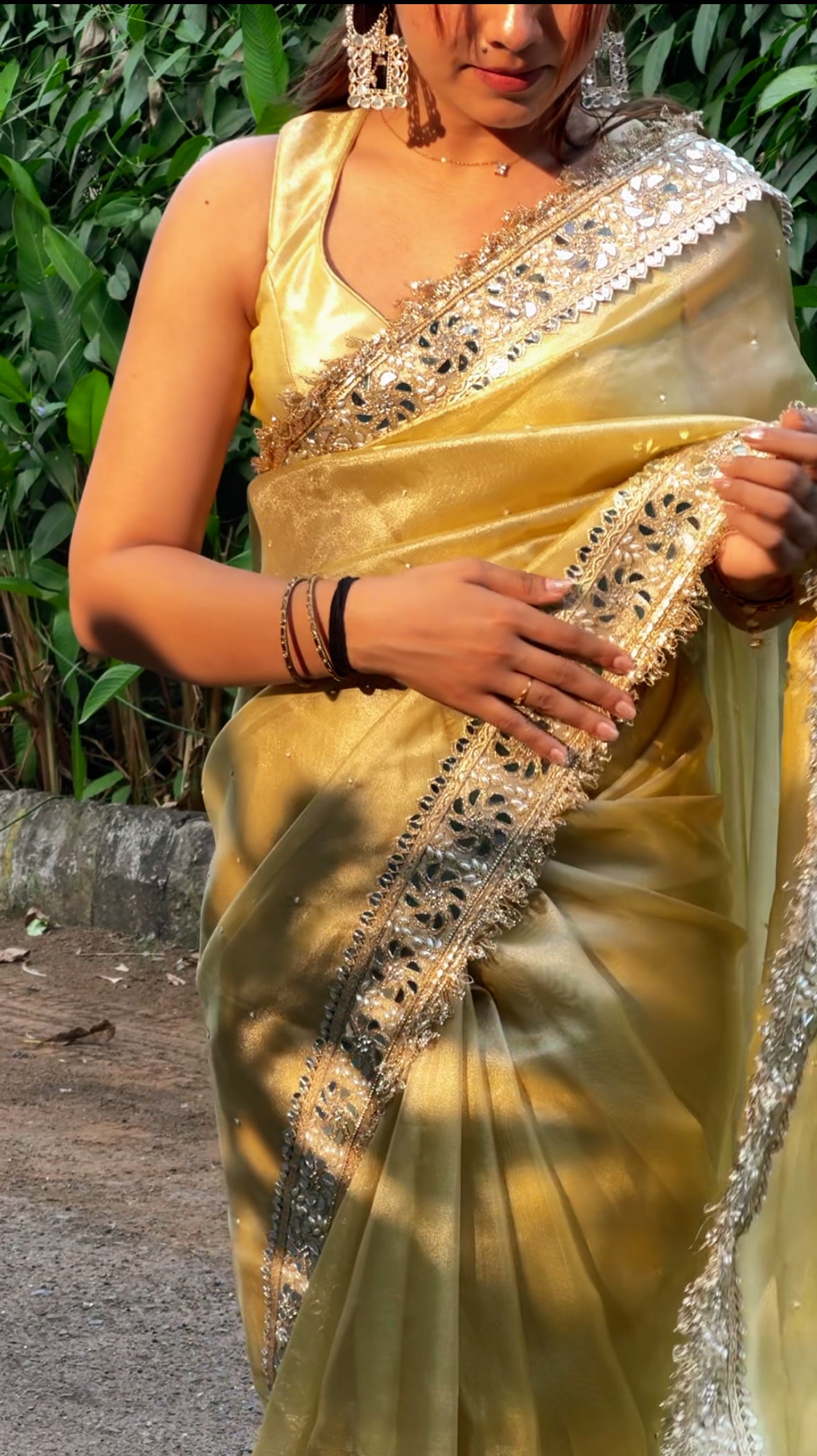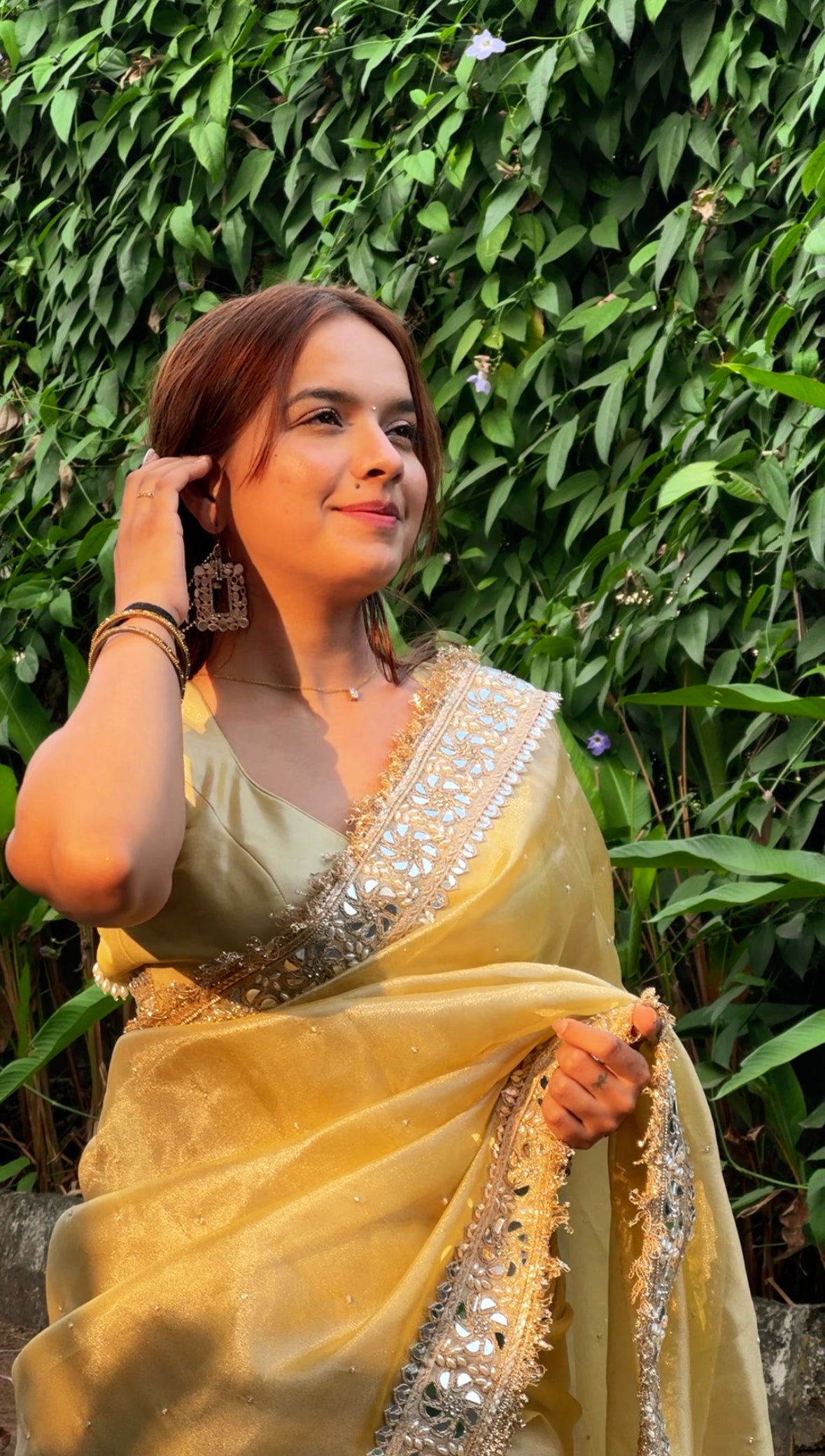 The mirror-worked border reflects the artisanal finesse of Banaras, merging tradition with modern understated luxury.
