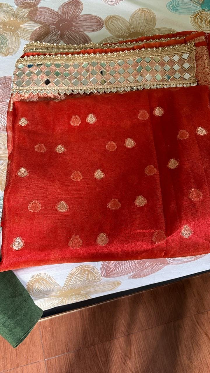 Rust Orange Banarasi Rajwada Mirror Work Tissue Silk Saree - A color of devotion and dazzle, where every mirror reflects grace, and every drape whispers heritage.