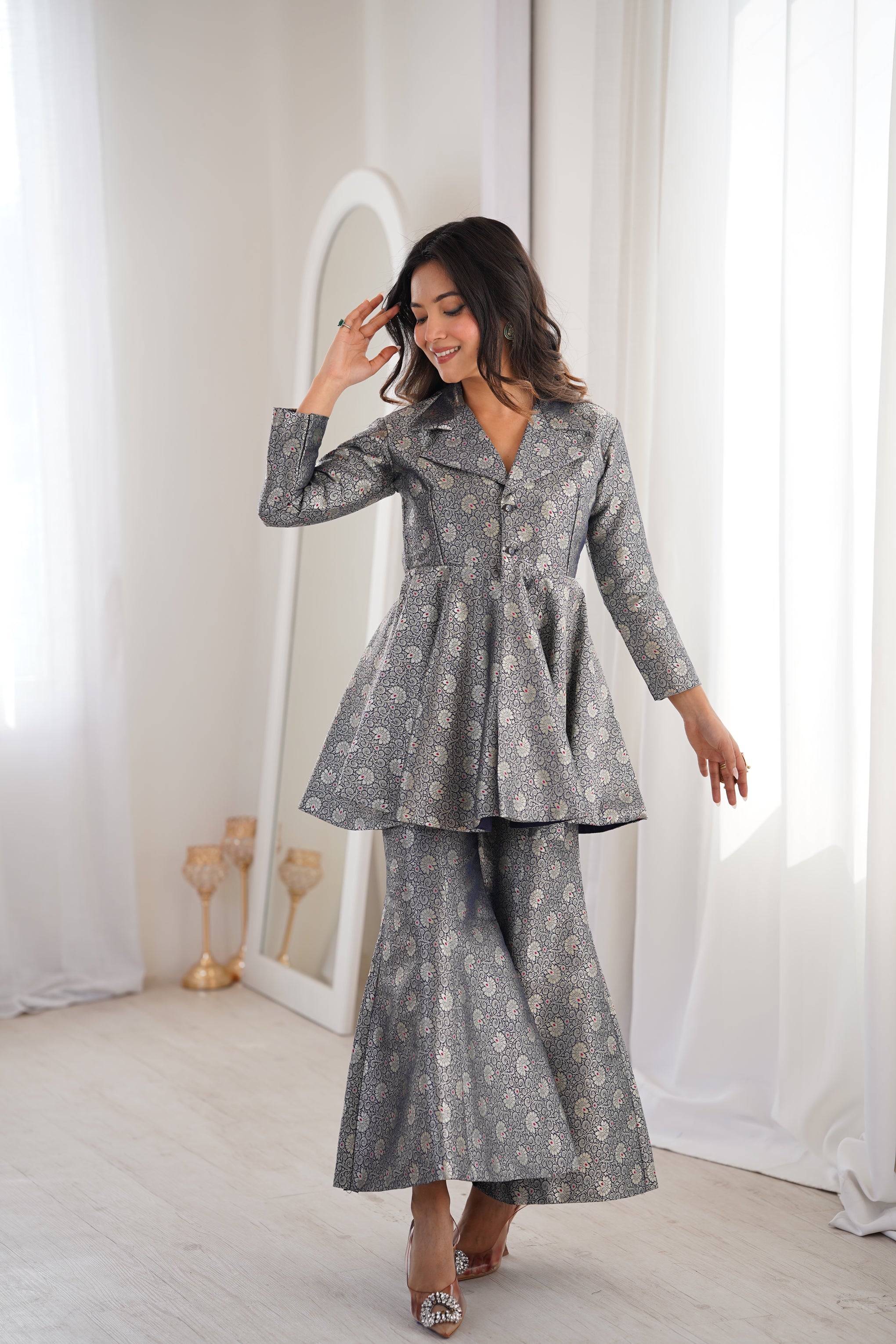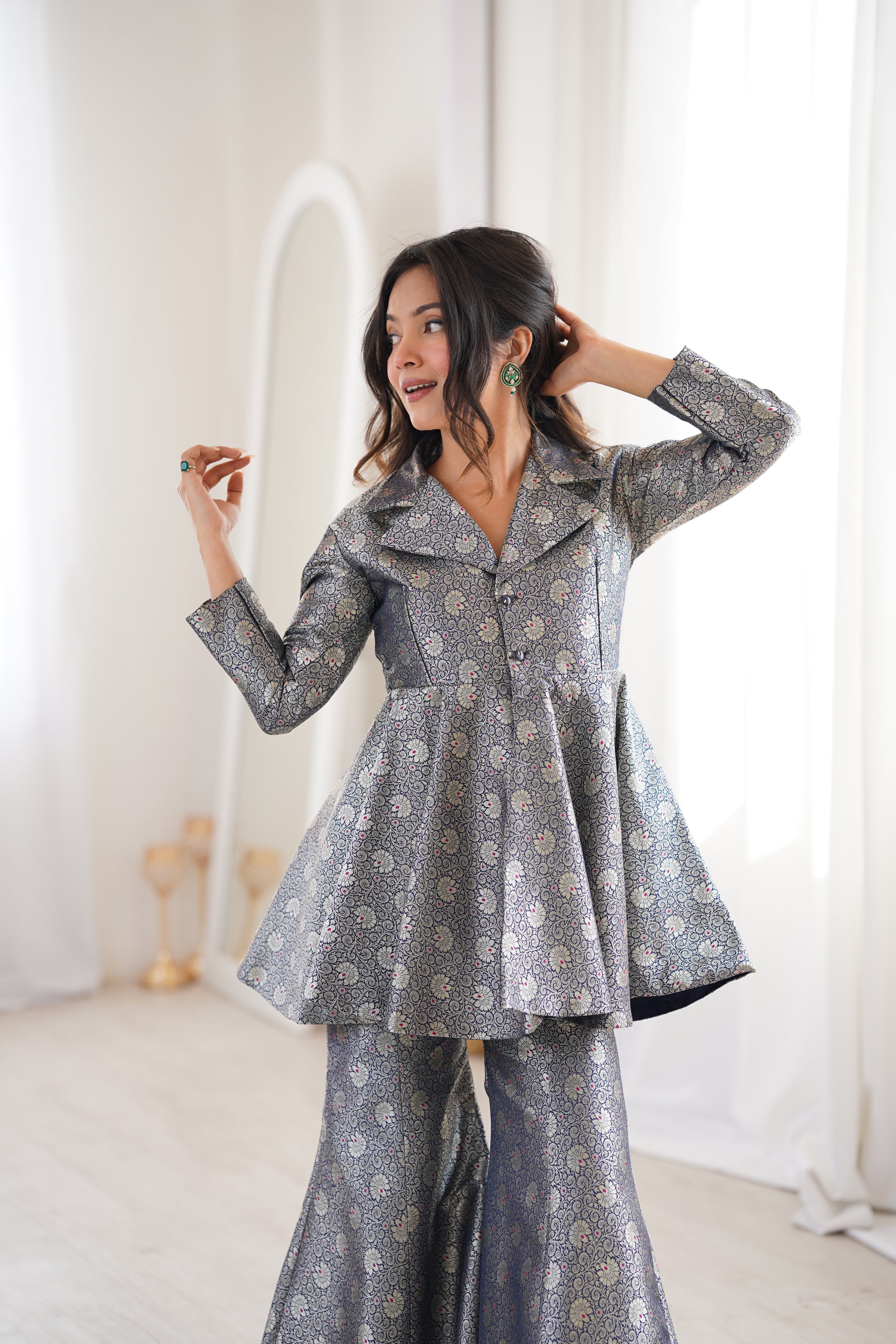 A graceful blend of structure and softness, this navy blue brocade co-ord set features a tailored peplum top paired with fluid flared pants. Designed for modern festive dressing, it offers effortless elegance with a contemporary silhouette.
