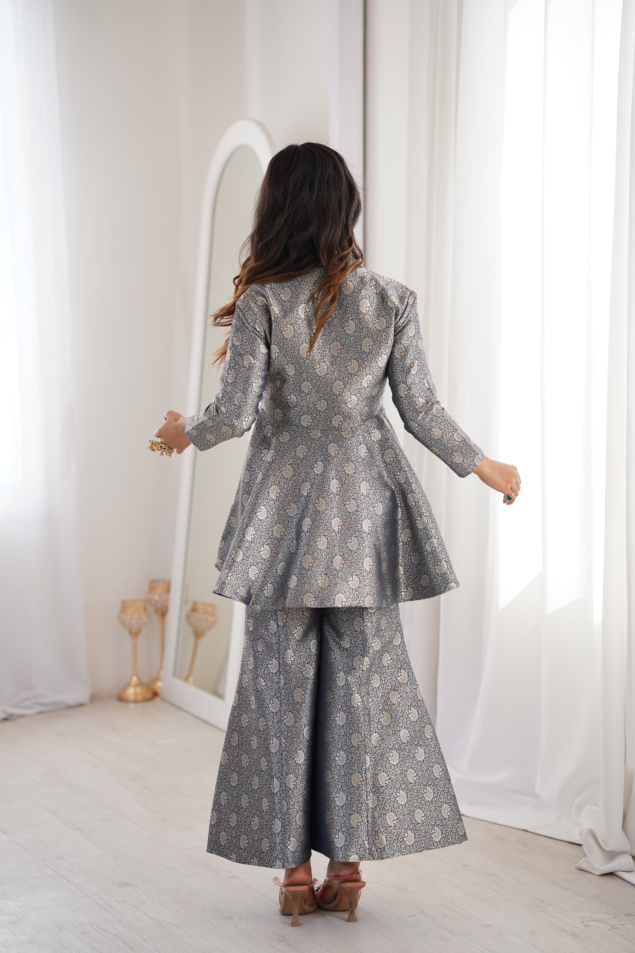Navy Blue Brocade Peplum Top Co-ord Set with Flared Pants