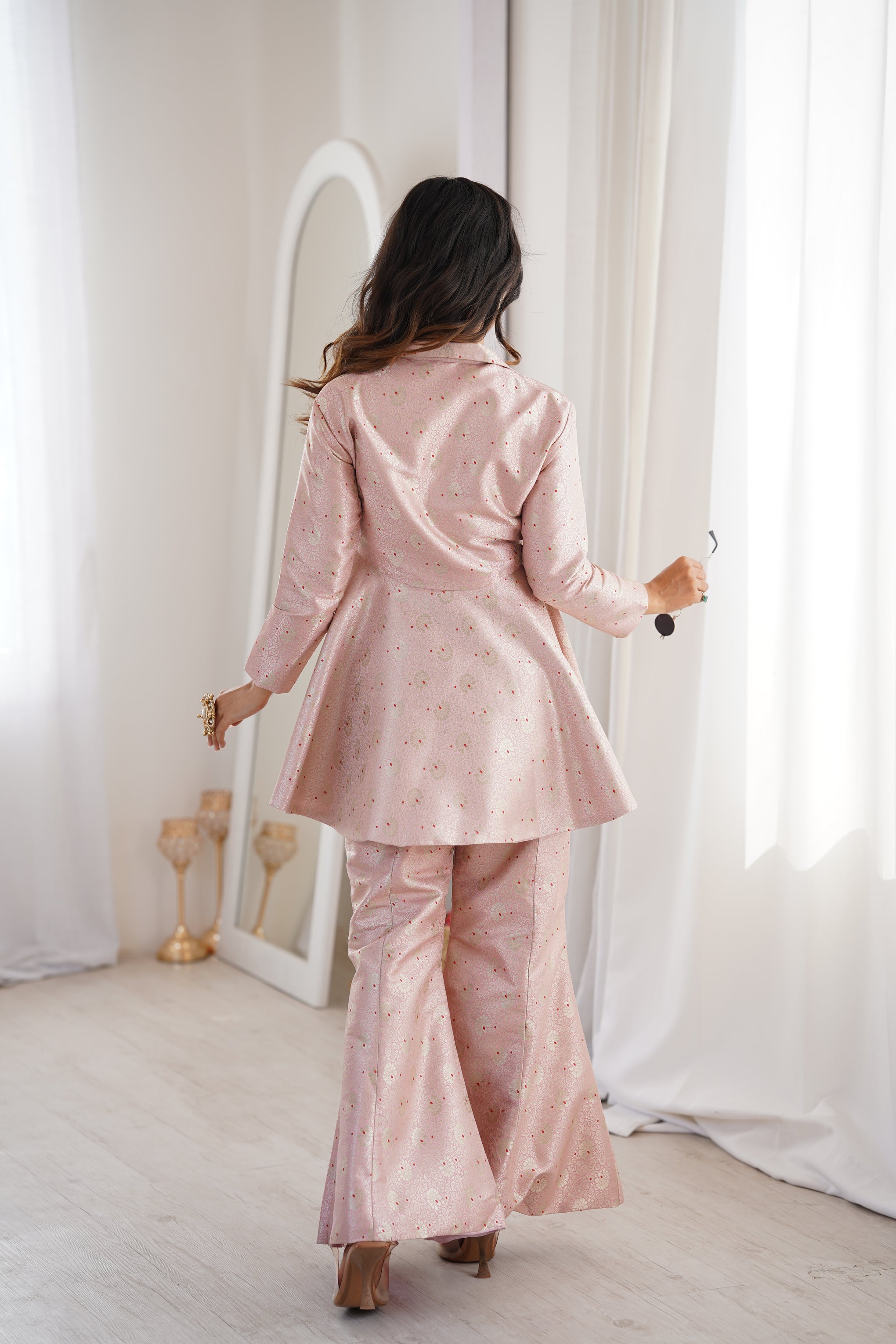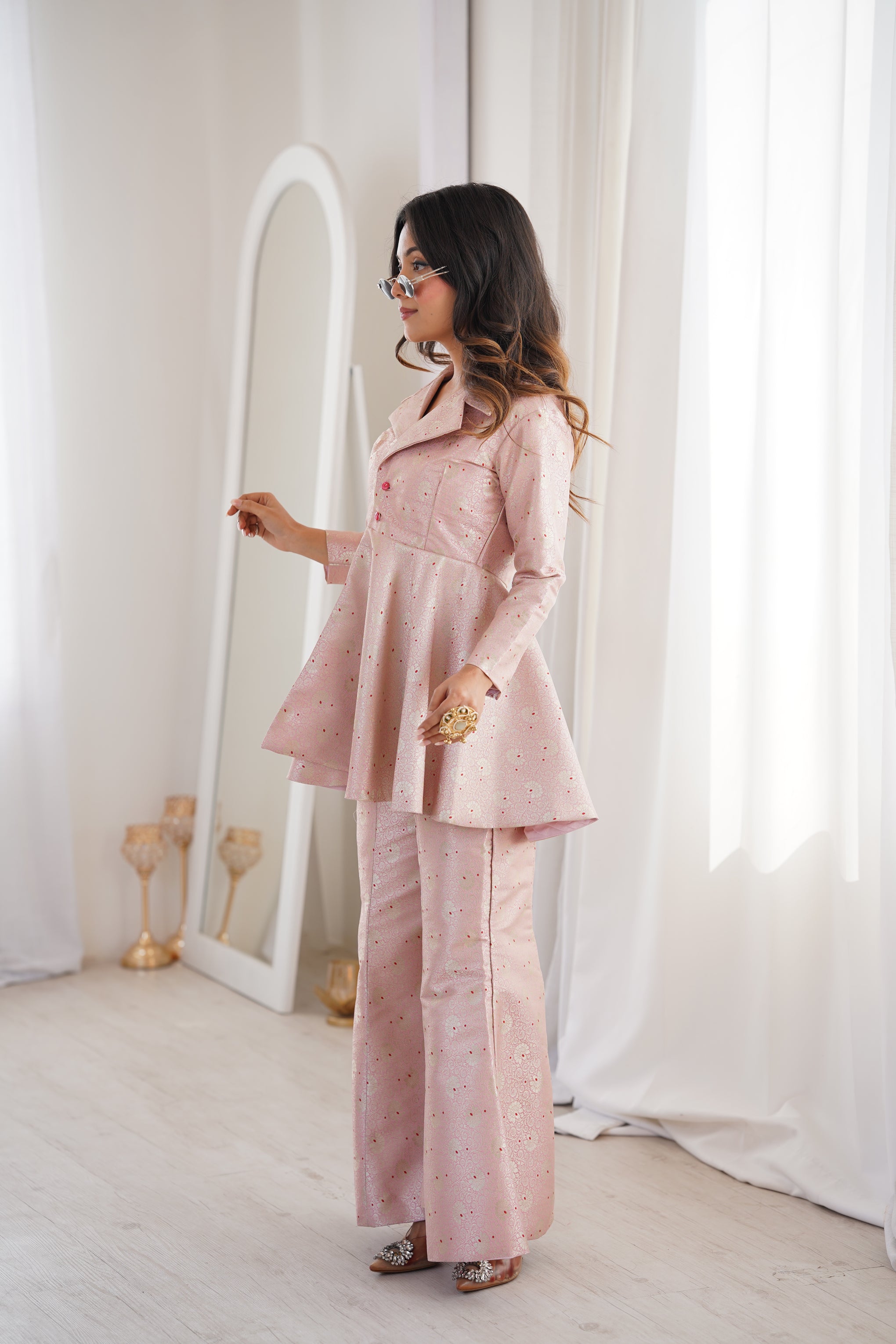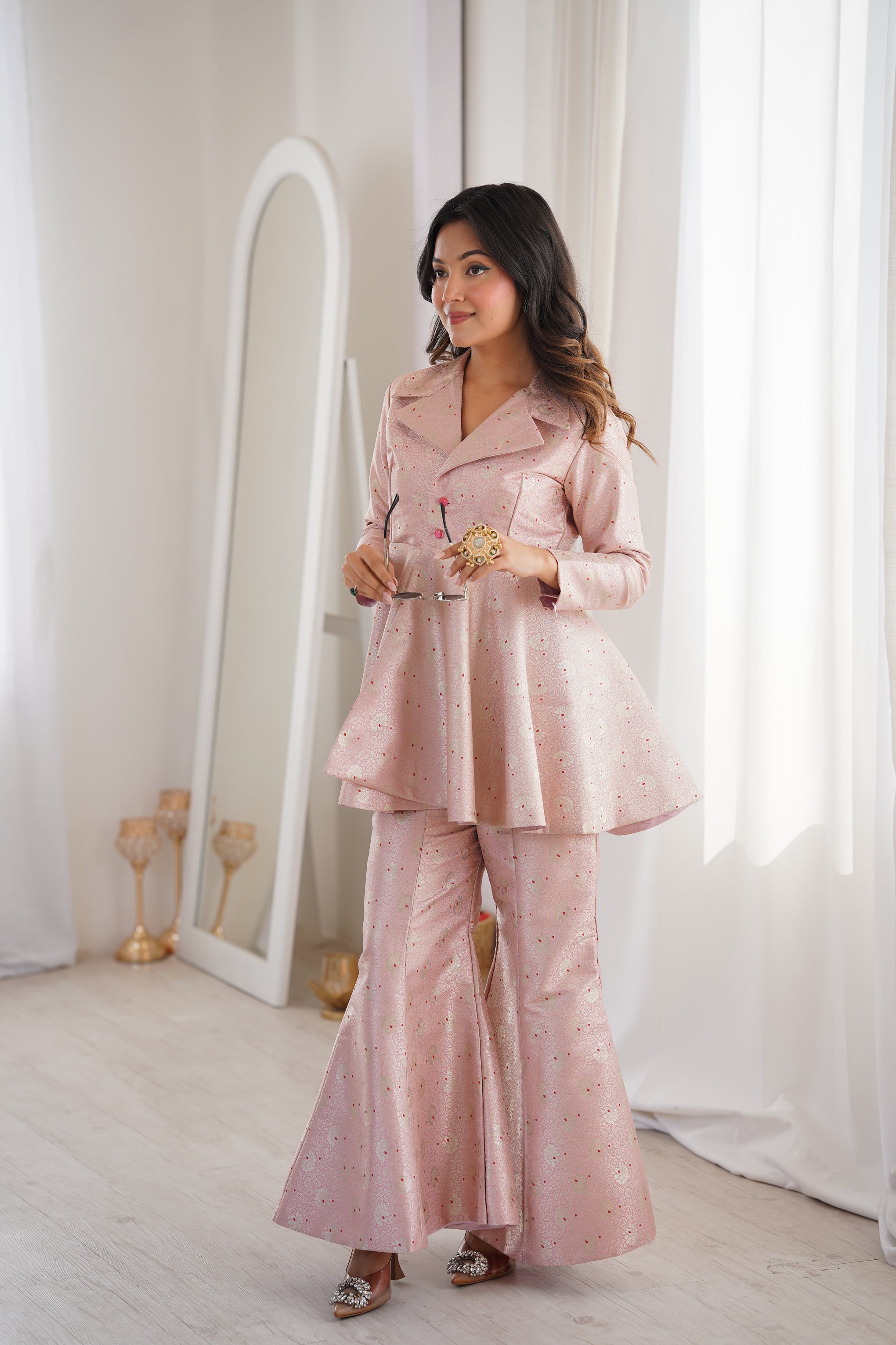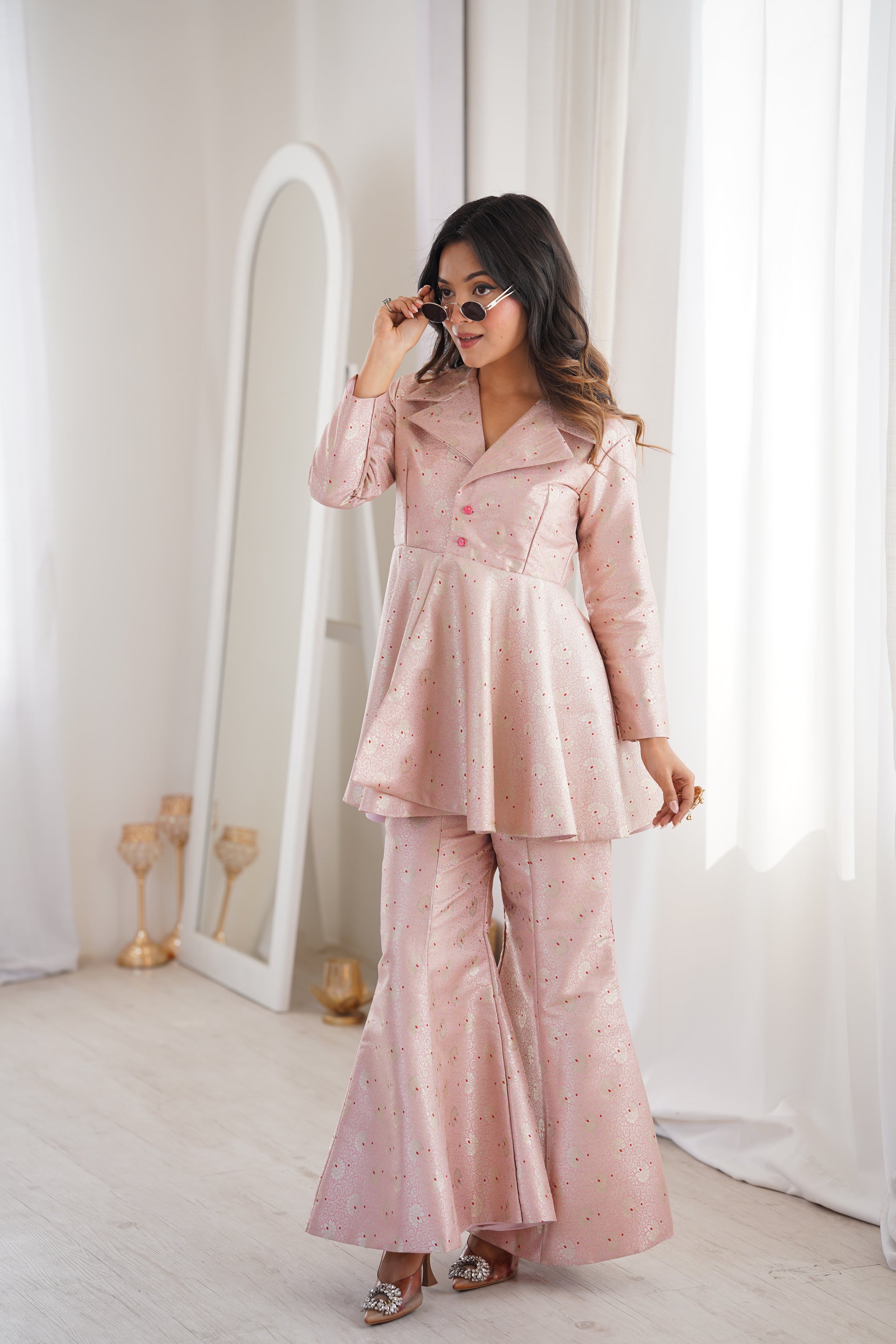 Pastel Pink Brocade Peplum Top Co-ord Set with Flared Pants