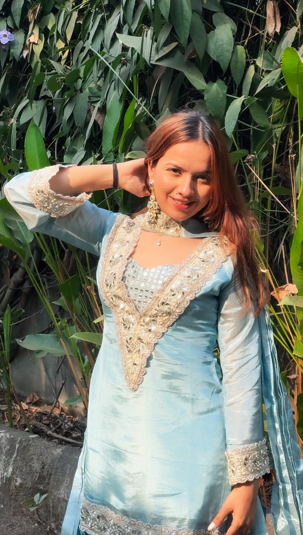 Powder Blue Afsara Mirror Work Tissue Sharara Suit Set