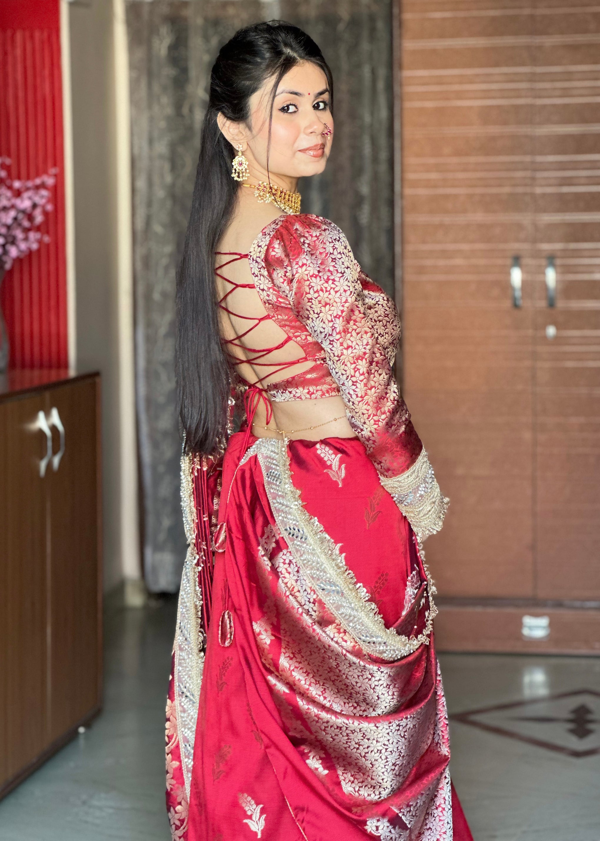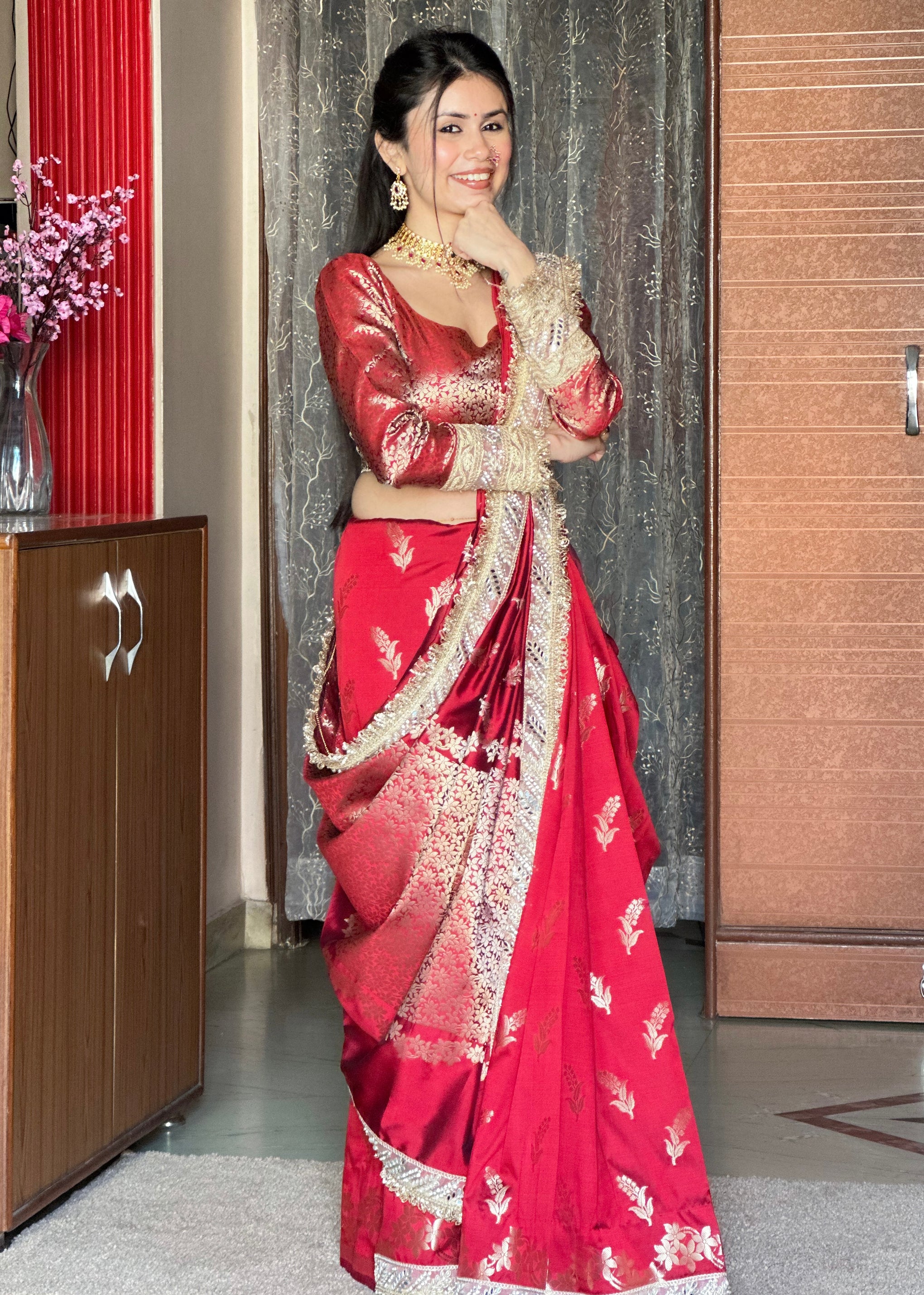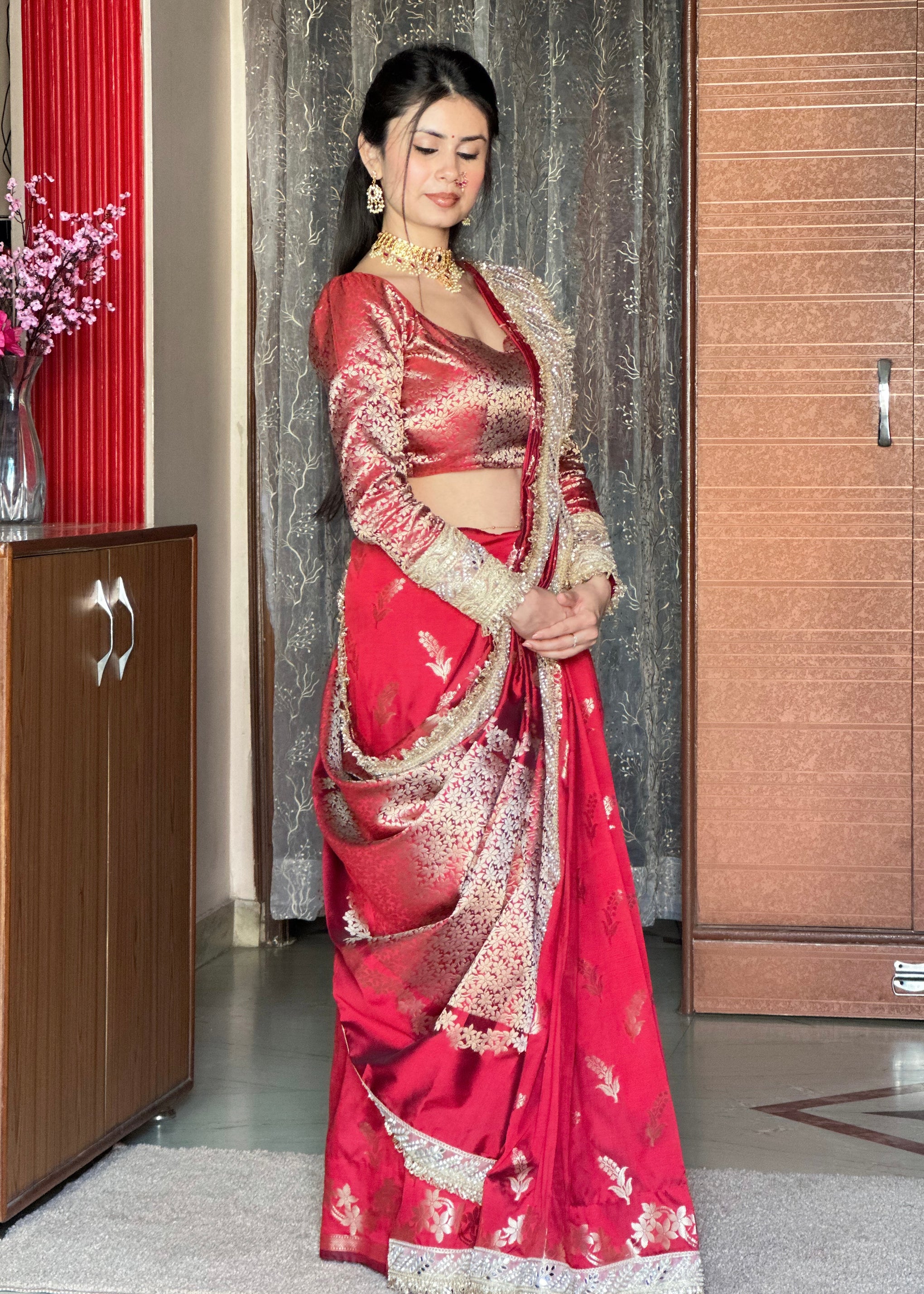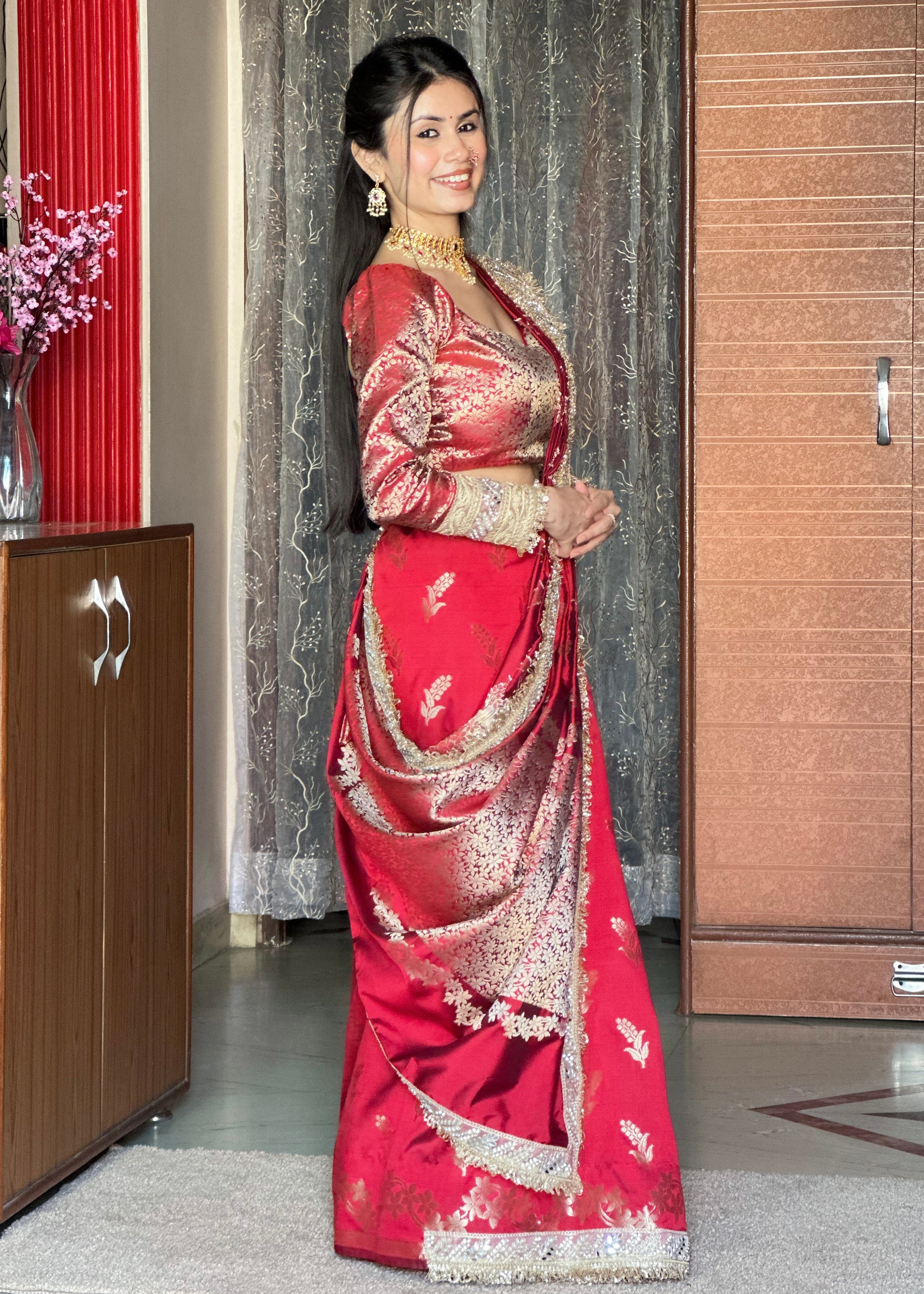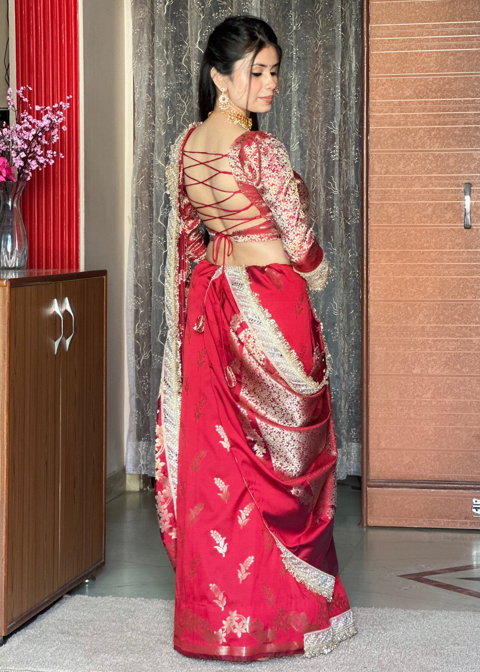Royal Red Banarasi Nazakat Mirror-Pearl work Saree