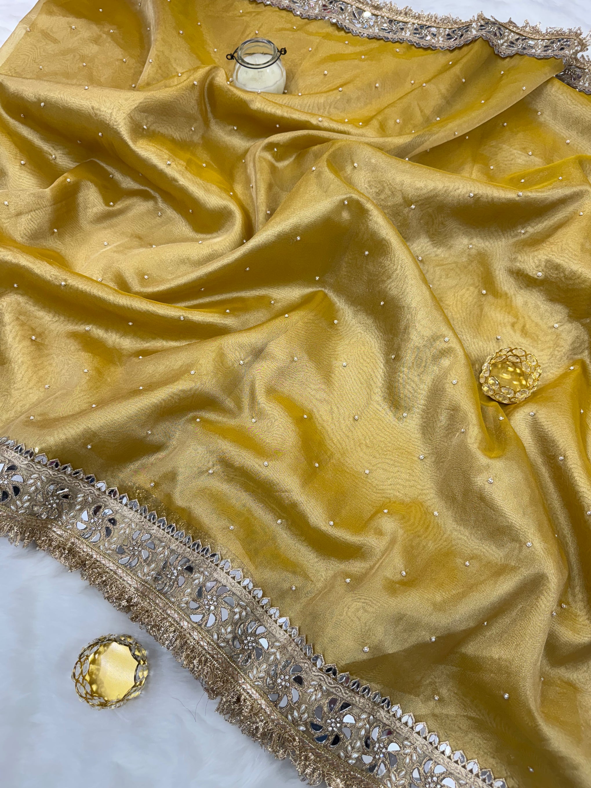 Noor-e-Zar — a celebration of gold, hand-crafted tissue silk adorned with delicate pearl motifs across its body.
