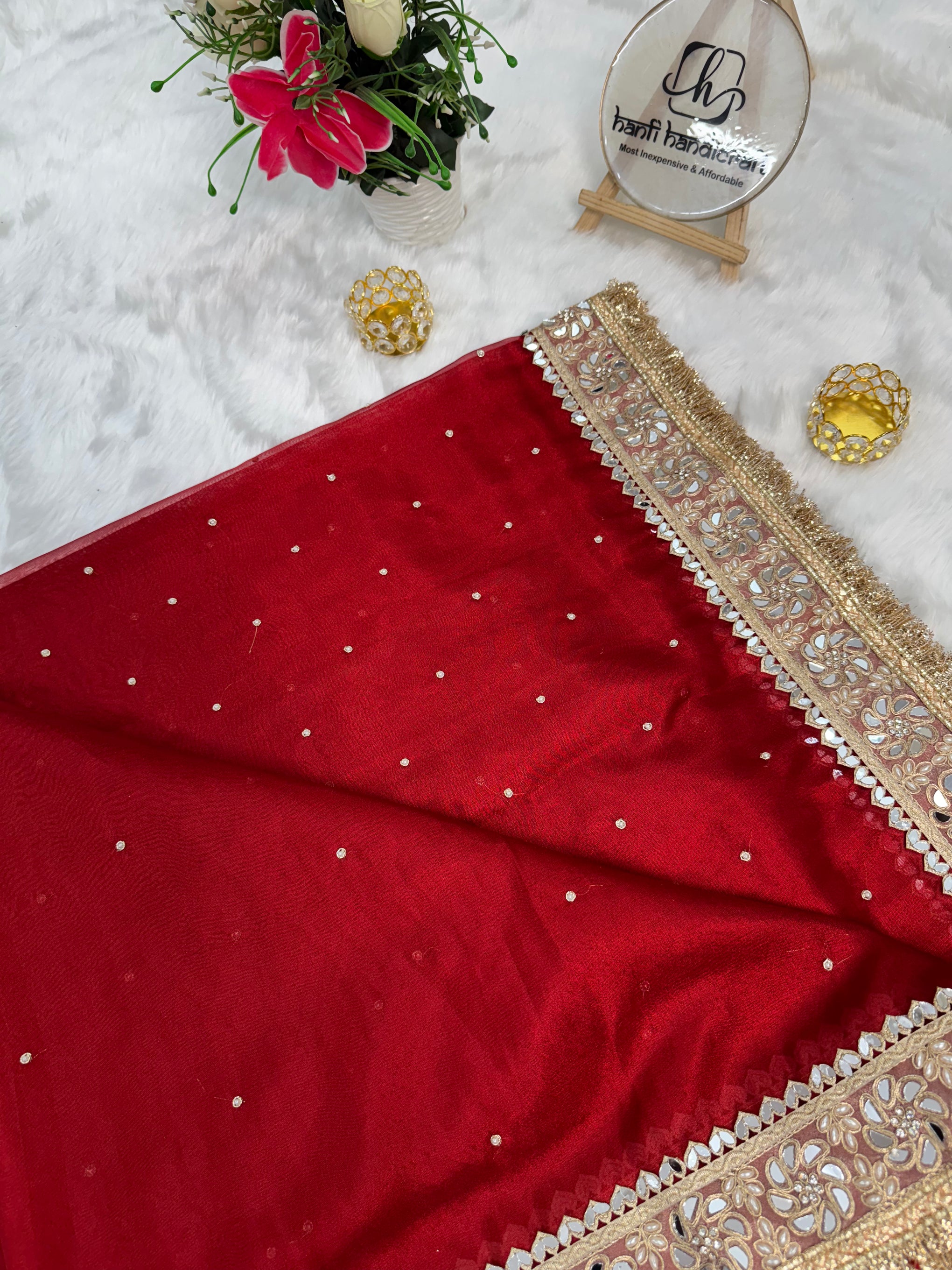 Noor-e-Zar — a celebration of red, hand-crafted tissue silk adorned with delicate pearl motifs across its body.