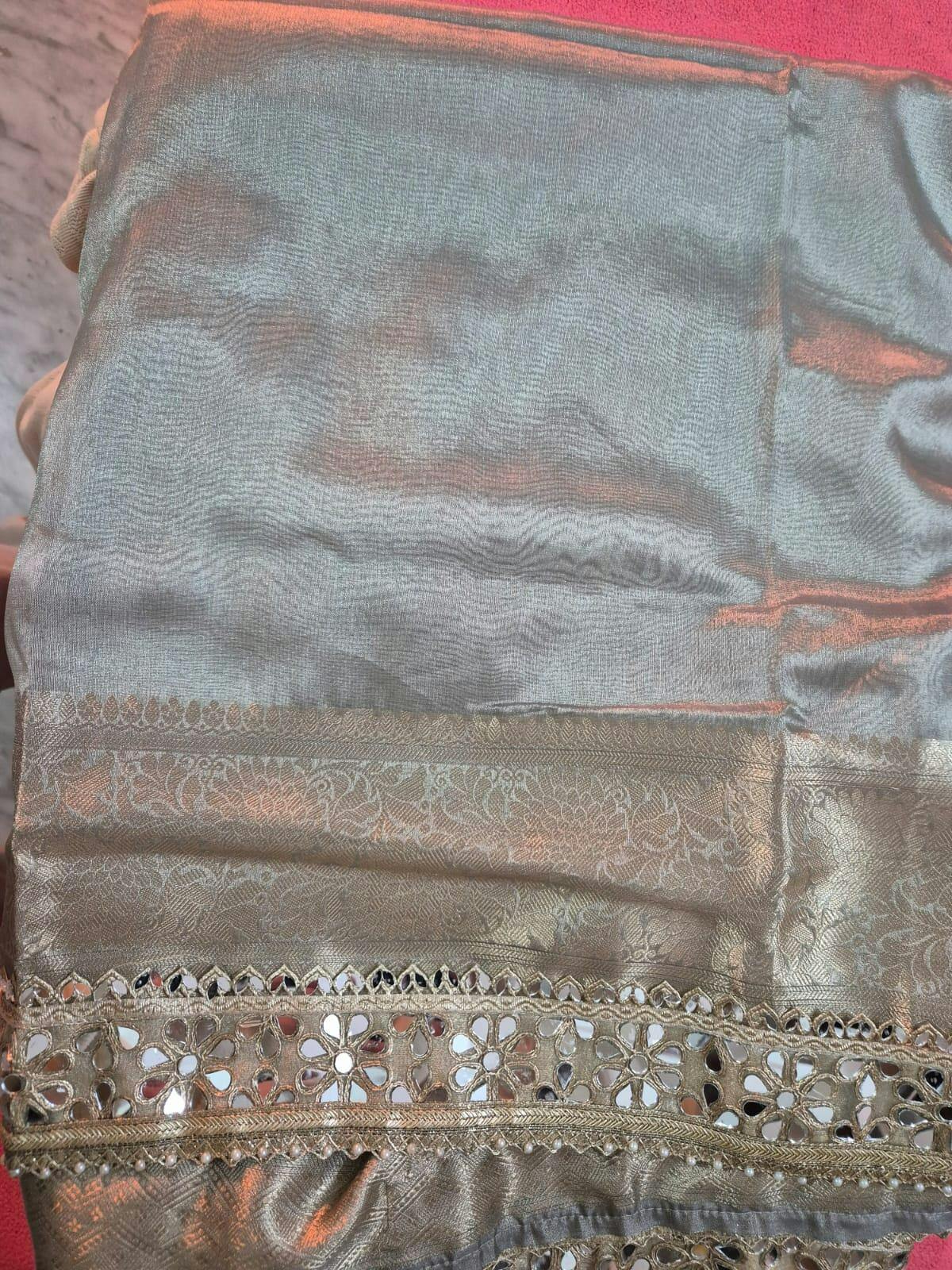 Moonlit Grey Banarasi Rajkumari Mirror Work Tissue Silk Saree
